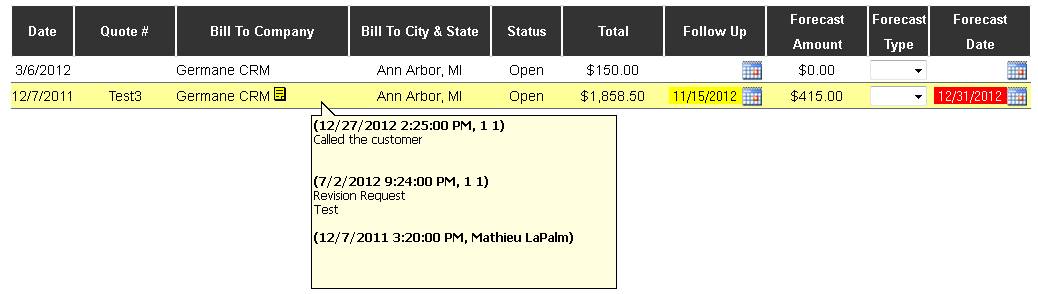 - Sales reps can quickly update the due date and forecast date on items, and you can easily see which are overdue